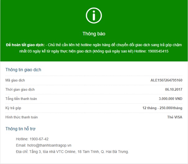 - Chủ thẻ cần liên hệ hotline ngân hàng để chuyển đổi giao dịch sang trả góp chậm nhất 03 ngày kể từ ngày thực hiện giao dịch (không quá ngày sao kê);
