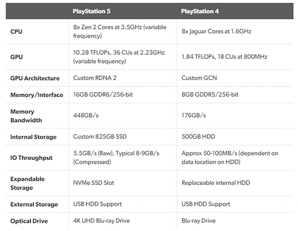 Trong đó, PS5 sẽ được trang bị CPU 8 nhân trên kiến trúc Zen 2 của AMD, xung nhịp dao động trong khoảng 3.5 Ghz. Về xử lý đồ họa, PS5 sẽ sử dụng GPU tùy biến dựa theo kiến trúc RDNA 2 của AMD. Với xung nhịp 2,23Ghz, hiệu suất PS5 đạt 10,28 teraflops cùng 36 đơn vị tính toán (Compute units). PS5 hoàn toàn có thể cân được các tựa game có đồ họa khủng ở độ phân giải 4k.