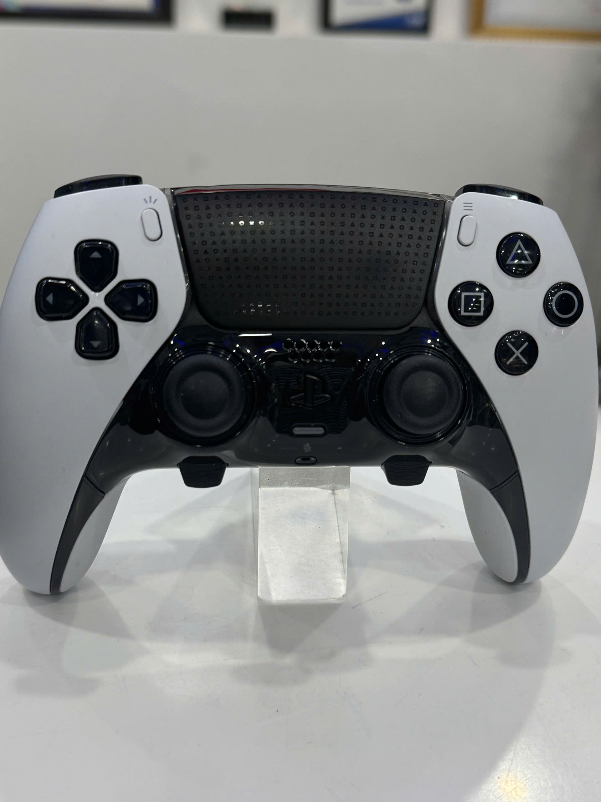 - Bộ điều khiển không dây DualSense Edge cũng có được trau chuốt vô cùng tỉ mỉ về mặt thiết kế, với tông màu phối đen trắng lấy cảm hứng từ bộ điều khiển DualSense và họa tiết PlayStation Shapes độc đáo trên touchpad và bề mặt của cò trigger